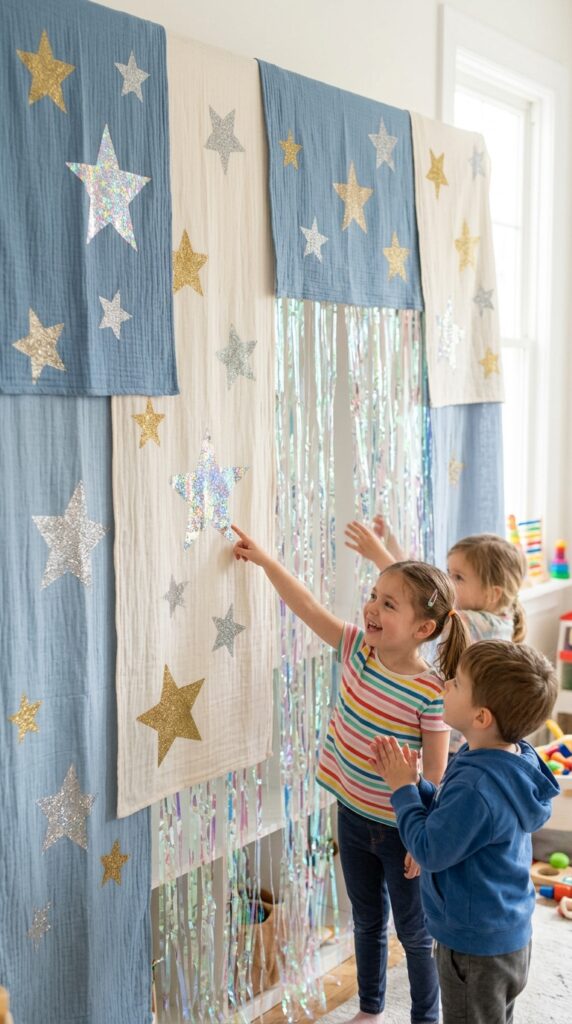 Try incorporating star stenciling patterns directly onto your backdrop using metallic paints. Gold, silver, and holographic options work beautifully together without looking overwhelming.