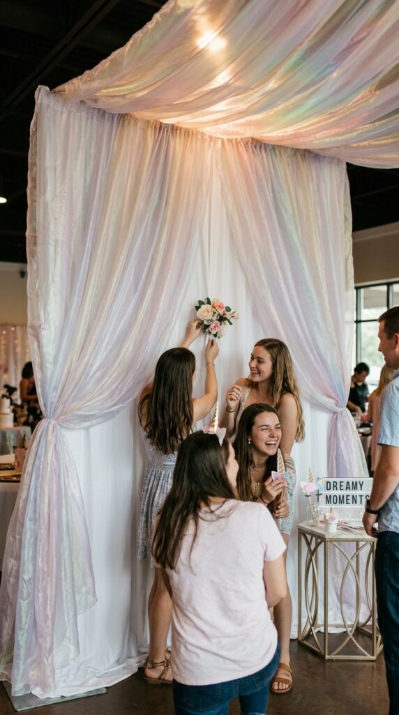 When you drape iridescent fabric across your backdrop frame, the results are honestly kind of magical. The fabric catches light from every angle, creating that rainbow-shift effect unicorns are basically famous for.