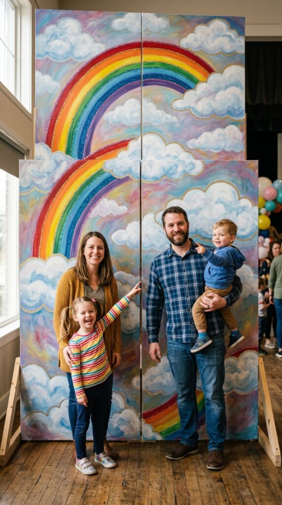 If you’re feeling crafty, painted backdrop panels might be your favorite option yet. Grab some large foam boards or canvas panels, then sketch soft clouds and arching rainbows directly onto them.