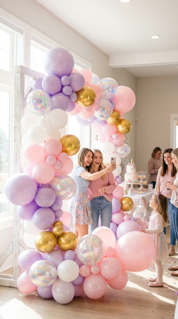 Balloon garlands are honestly one of my favorite backdrops for unicorn parties, and once you see how stunning they look, you’ll understand why. You’ll want to mix iridescent balloons with pastel pinks, purples, and whites for that dreamy unicorn aesthetic.
