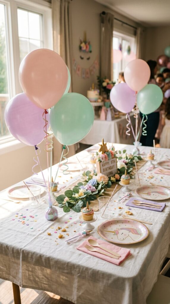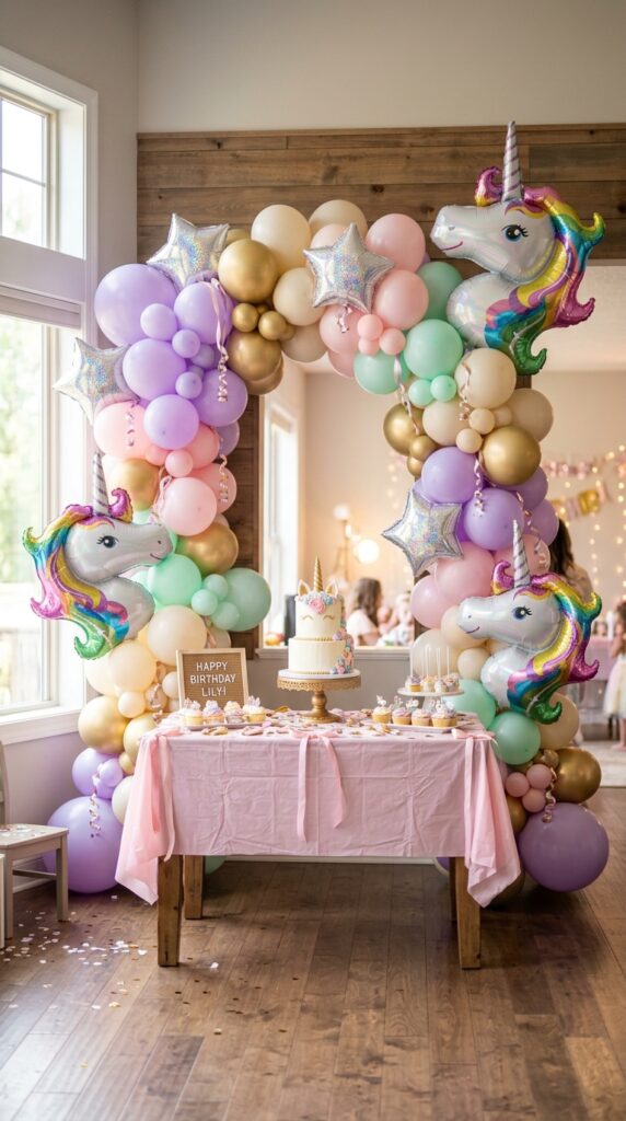 These custom balloon centerpieces anchor your entire party aesthetic instantly. Position them behind the cake table or gift station for maximum visual impact. Trust me, every single photo taken will capture them beautifully. To complete the look, coordinate your balloon colors with a unicorn birthday cake featuring matching iridescent and pastel details for a cohesive, magical display.