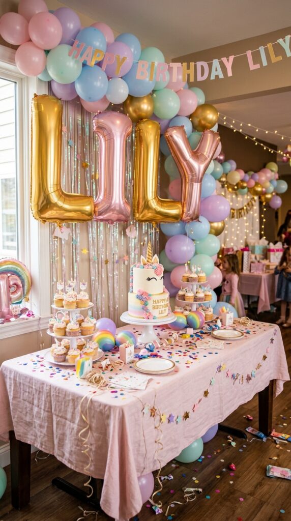 Once you’ve got those dreamy ceiling clouds sorted, it’s time to make the birthday star feel truly special. Spell out their name using large foil letter balloons featuring a unique unicorn design — think pastel colors, glitter accents, and rainbow fonts.