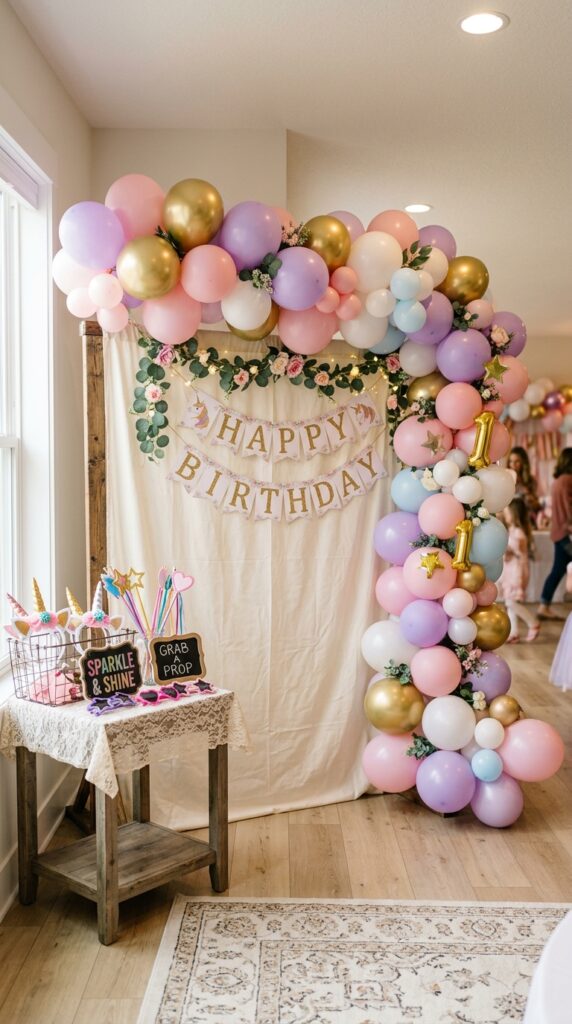 Don’t shy away from intricate balloon designs featuring stars, horns, and pastel swirls. They add serious visual depth without overwhelming your setup. Mix silver and holographic foil balloons with softer hues like lavender and blush. Trust me, your guests won’t stop talking about it. That’s one photo backdrop worth every penny. Pairing your balloon arch with a unicorn party backdrop creates a layered, enchanting photo setup that elevates the entire aesthetic.