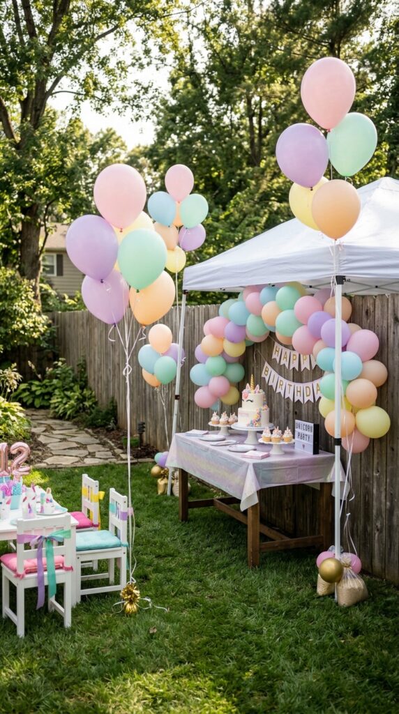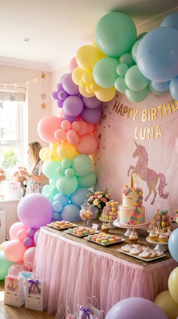 Start with pastel balloon bouquets in soft pinks, lavenders, and mint greens, then layer in bolder colors for depth. The contrast creates that signature unicorn aesthetic everyone loves.
