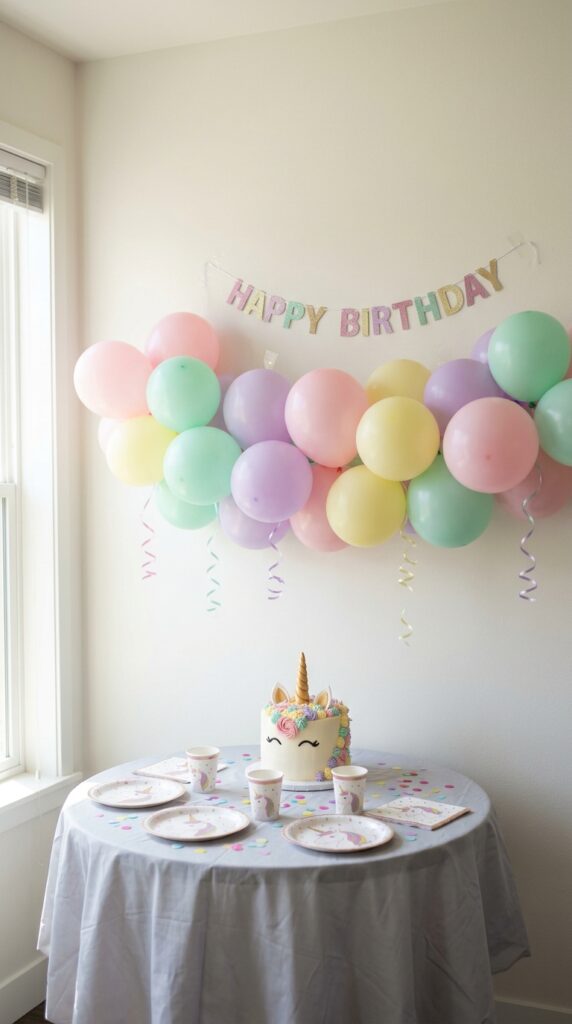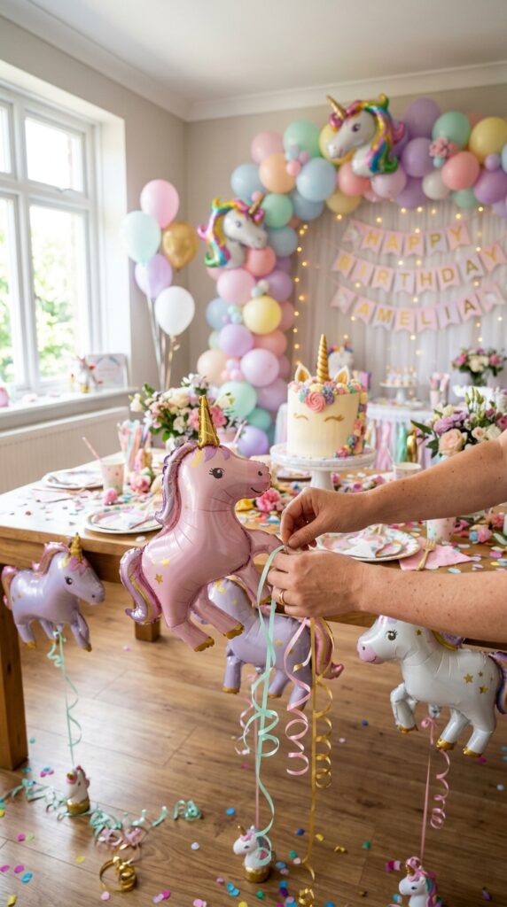 Add DIY unicorn horn balloon accents like small star-shaped foil balloons or glittery streamers around the base. Place them on tables using weighted balloon holders, and you’ve instantly created eye-catching focal points that tie your entire unicorn theme together beautifully. For even more visual impact, incorporate pastel color crafts like hand-painted signs or tissue paper flowers to complement the balloon display throughout your party space.