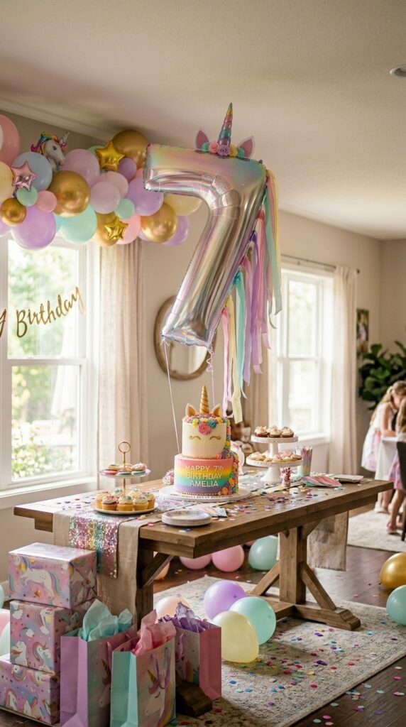 You can also add customized balloon messages like “Magical 7-Year-Old” or “Unicorn Princess Ava” for that personal touch. Vendors like Etsy sellers and party supply stores offer these readily.