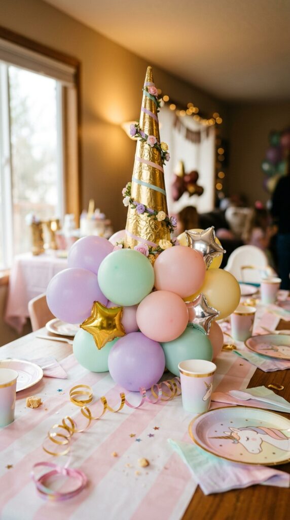 If you want a centerpiece that doubles as decor and a conversation starter, DIY unicorn horn balloon centerpieces are your best bet. Grab a cone-shaped foam base, wrap it in gold foil, then surround it with pastel balloons arranged in clusters.