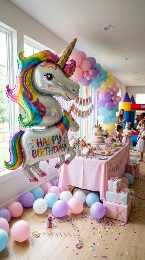 Place them as your unicorn balloon centerpiece arrangements on tables or near the cake display for instant wow factor. You can even order personalized unicorn balloons with your child’s name printed directly on them — a small detail that makes a huge impression. Trust me, guests will absolutely stop and snap photos. To complete the enchanted look, consider coordinating the balloon display with unicorn birthday outfits for the birthday girl and guests to create a fully themed, cohesive celebration.