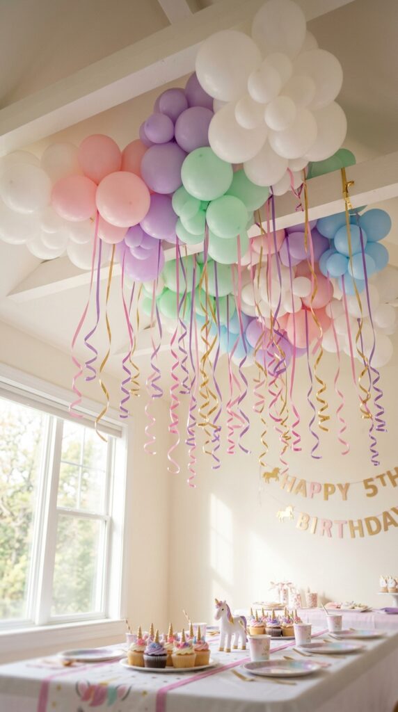 Here’s where the magic happens: attach curling ribbons in pink, purple, gold, and teal, letting them cascade downward at varying lengths. These dangling ribbons catch every breeze, creating gentle movement throughout your space.
