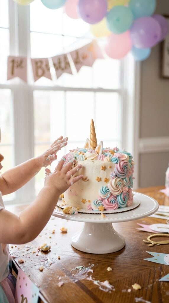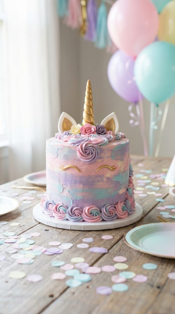 Finish with edible glitter application across the buttercream canvas, and watch everything change. A light dusting catches light beautifully, making this cake genuinely breathtaking without requiring advanced decorating skills. To complete the full celebration aesthetic, pairing this cake with unicorn party decor like iridescent balloons and pastel streamers creates a cohesive magical atmosphere guests will love.