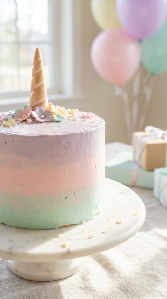 While rainbow swirls bring the energy, sometimes you want something a little softer — and that’s where the Dreamy Pastel Ombre Unicorn Cake shines.