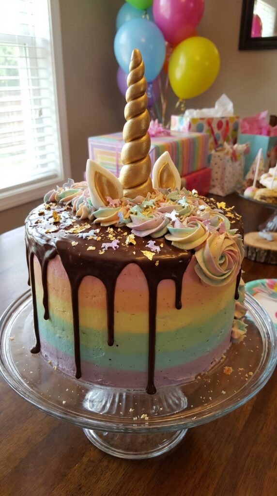 Here’s what happens when drama meets dessert — the Drip Cake With Unicorn Glitter and Gold Horn takes everything up a notch. Those gorgeous chocolate drips cascade down smooth frosting like something straight off a dessert magazine cover. You’ll scatter edible gold flakes across the top for serious wow factor, and trust me, they catch the light beautifully.