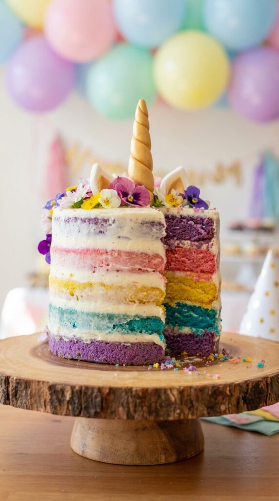 Among unique unicorn cake decorating techniques, this one rewards minimal effort with maximum visual drama. You’ll use just a thin buttercream scrape around the exterior, then crown the top with flowers, a golden horn, and ears. The exposed layers become the decoration. Honestly, the cake does most of the work itself. A naked unicorn cake is especially fitting for baby’s 1st birthday, where the colorful layers mirror the sweet and playful spirit of the celebration.