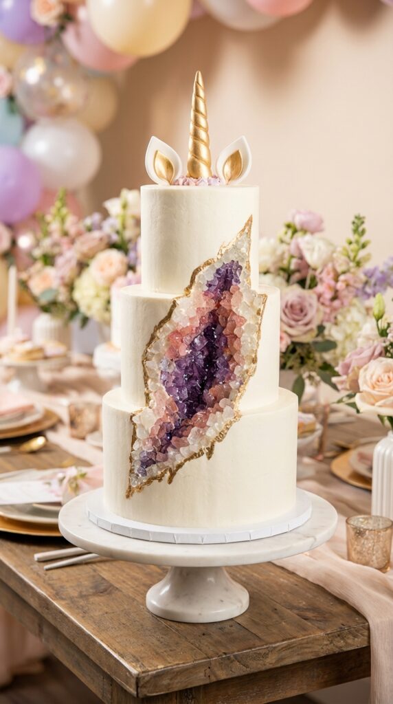 Stepping away from that effortless naked-cake look, let’s talk about something that requires a bit more patience but delivers absolutely jaw-dropping results. A geode-style unicorn cake mimics natural crystal formations inside the design, making it look like a magical rock split open.