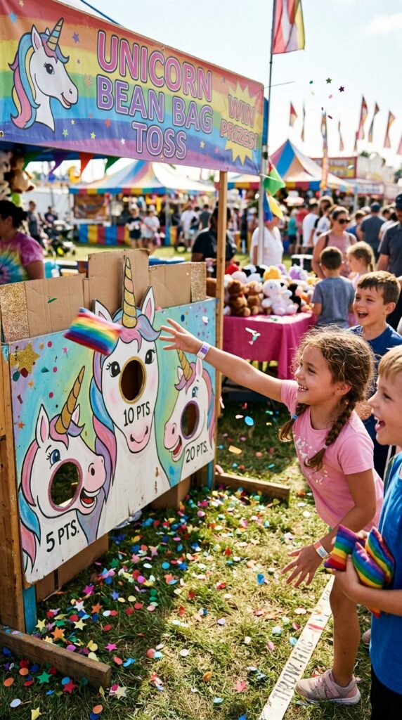 Set up unicorn themed carnival games like a bean bag toss using painted cardboard cutouts of unicorn horns as targets. Assign different point values to each horn.
