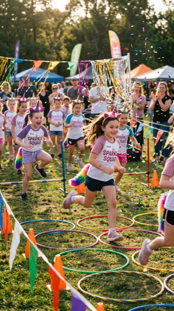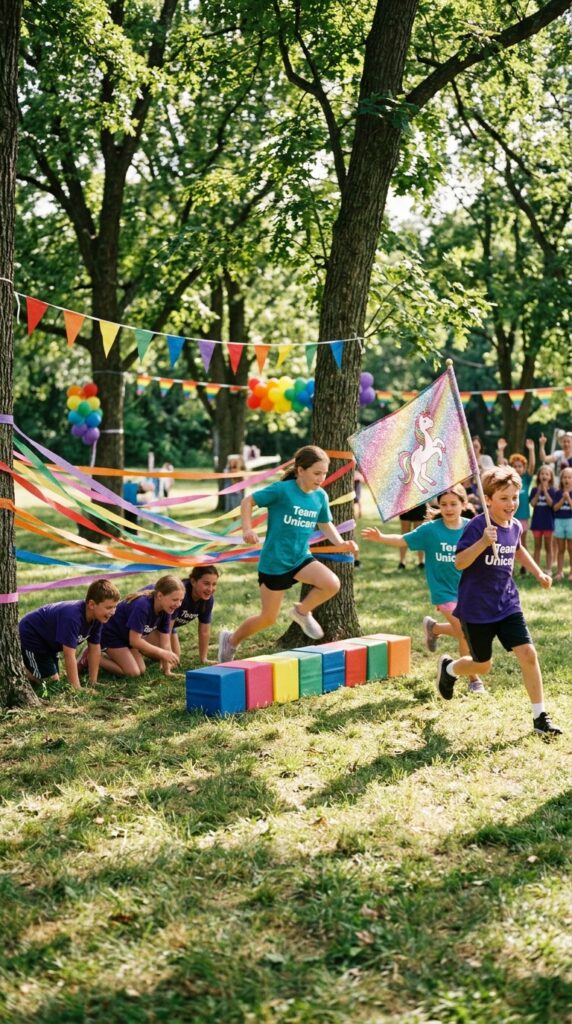 Here’s the fun part — turn it into a silly costume relay! Each runner must wear a unicorn horn headband and rainbow tail before racing through the course. Add challenges like skipping, spinning, or neighing loudly. This activity works beautifully as part of a broader magical unicorn party theme designed specifically for toddlers around age three.