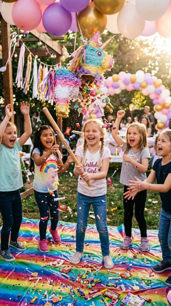 Every great unicorn party deserves a grand finale, and nothing beats a piñata smash to close things out. Hang a unicorn piñata filled with candy, small toys, and rainbow confetti for maximum excitement.