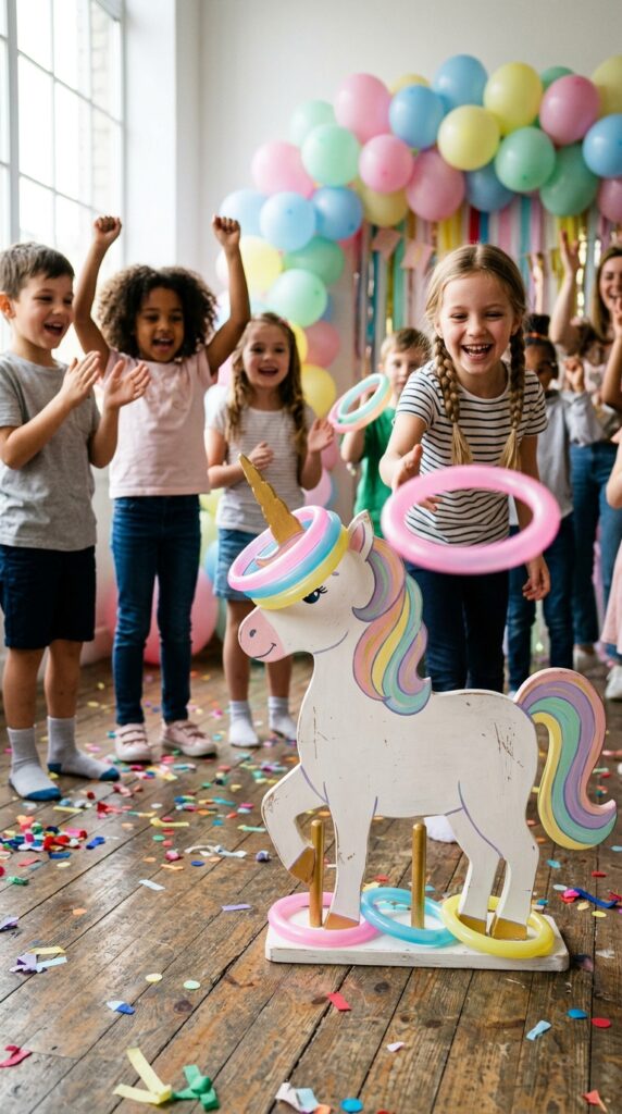 Set up a unicorn-shaped ring toss stand and assign each ring color a point value for unicorn themed scoring. Pink rings might earn five points, while purple rings score ten.