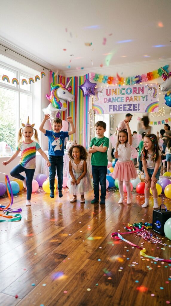 Try musical freeze dance variations to maintain excitement — pause the music unexpectedly, require frozen poses matching unicorn characters, or eliminate players each round. You’ll notice kids laughing harder with every freeze. Keep rounds short, roughly 90 seconds each, so nobody loses interest. This game shifts seamlessly into your next activity.