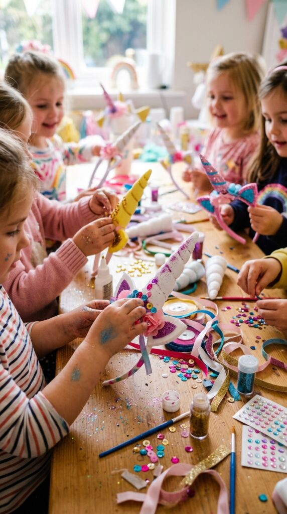 Your glitter and sequin table becomes the star attraction — kids go absolutely wild for sparkly supplies. Lay out fabric glue, colorful feathers, and adhesive gems so everyone customizes their headband their way.
