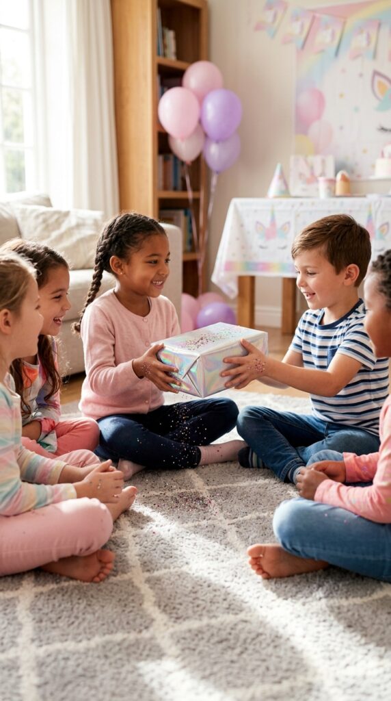 Once the headbands are finished and everyone’s admiring their sparkly creations, it’s the perfect moment to gather the group for Pass the Glittery Unicorn Parcel. Wrap your prize in multiple layers of holographic paper, sprinkling glitter between each layer — that’s your glitter distribution strategy working its magic.