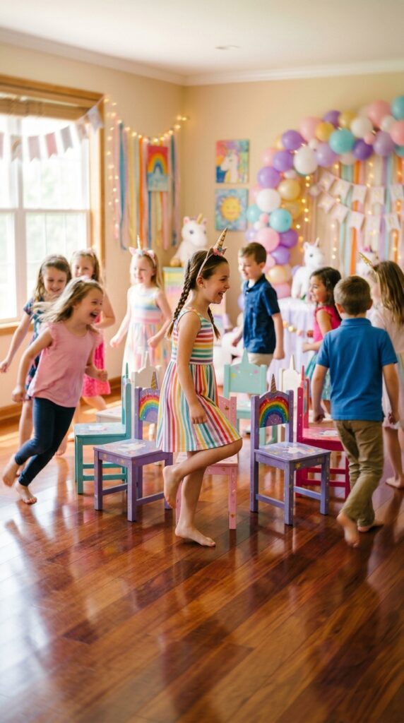 When the music stops, everyone freezes — think rainbow themed unicorn freeze tag meets classic musical chairs. The last child standing after each round wins a sparkly prize.