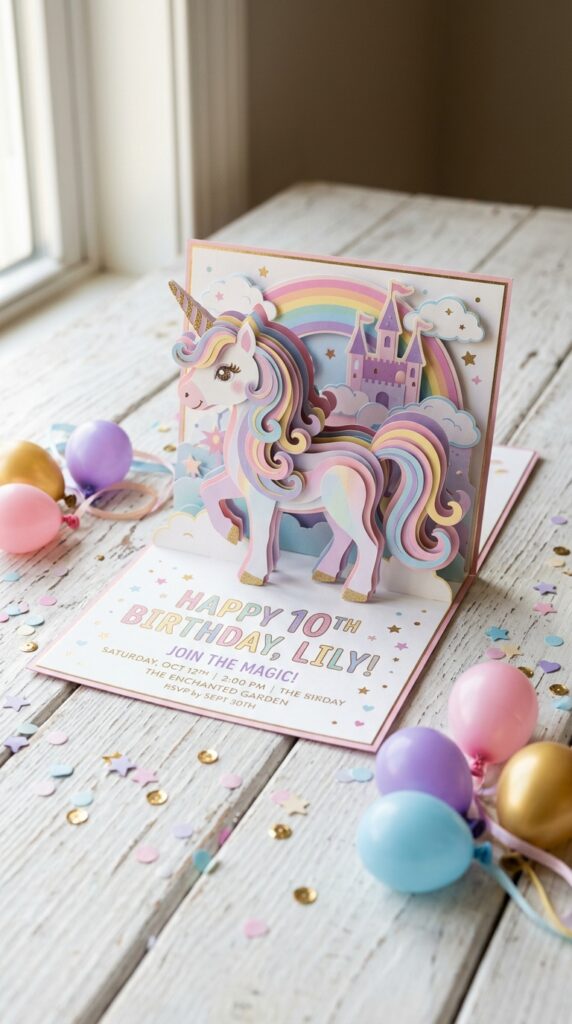 If you really want to make jaws drop before the party even starts, pop-up and 3D unicorn invitations are your secret weapon. Using pop up mechanisms, the unicorn literally springs off the card when your guests open it. That’s an unforgettable first impression.