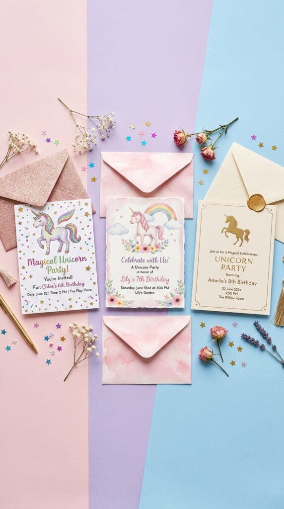 Unicorn parties aren’t just for the toddler crowd anymore — older kids want in too, and they deserve invitations that actually match their vibe. Think sleek designs with muted purples, rose gold accents, and minimal glitter overload.