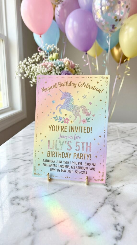 Consider printing on holographic paper for an extra dimensional effect that photographs beautifully. The material reflects light like a prism, making your invitations feel genuinely special rather than ordinary store-bought cards. Pairing your invitations with whimsical unicorn decor throughout the party space creates a cohesive visual experience guests will remember long after the celebration ends.