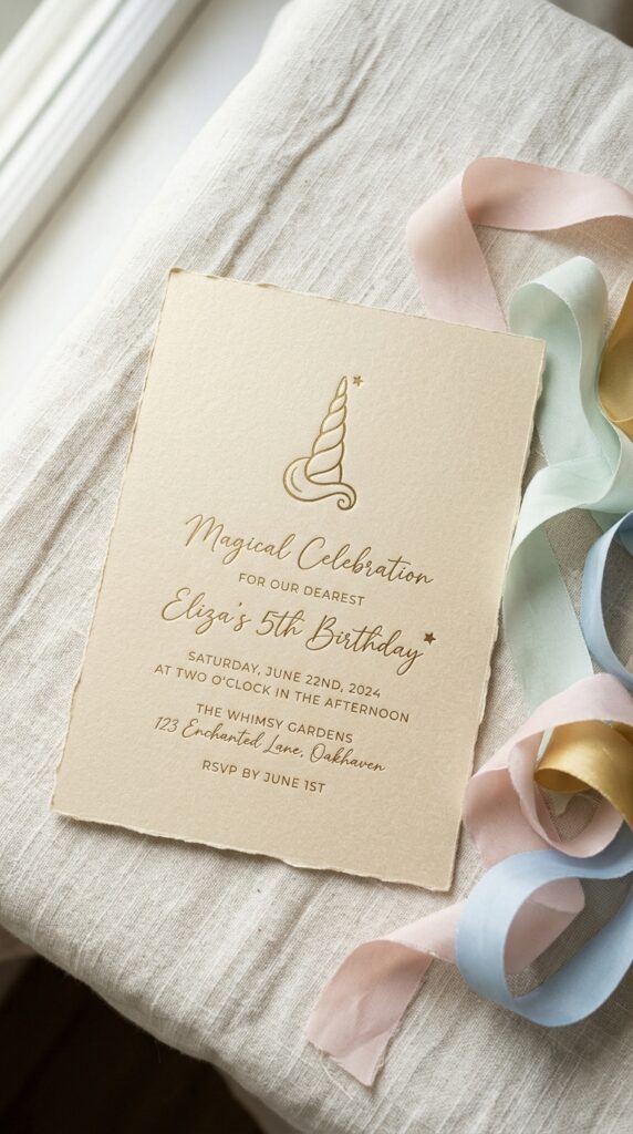 While bold rainbow designs steal the spotlight, minimalist unicorn invitations carry their own quiet magic. They use simple color schemes — think soft ivory, blush pink, or pale gold — to create something effortlessly sophisticated.