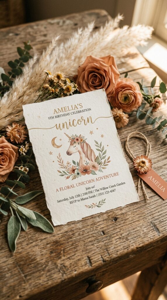 Many floral unicorn invitations lean into boho aesthetics beautifully, pairing wildflower wreaths, watercolor botanicals, and earthy tones with that signature spiraled horn. These designs feel relaxed yet intentional, which makes them perfect if you’re planning a garden-style or outdoor birthday celebration.
