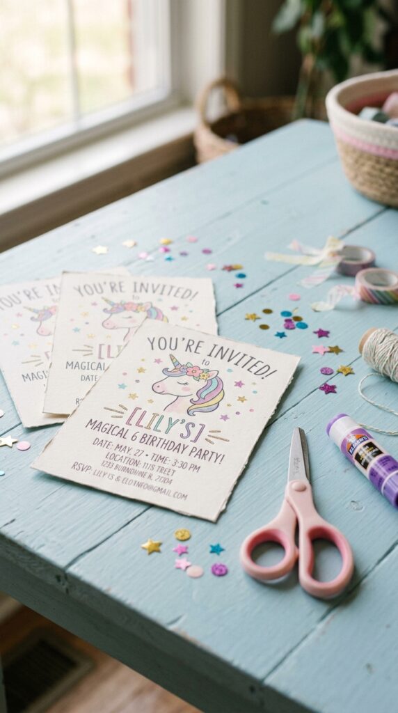 Sites like Canva, Etsy, and Minted offer templates that blend seamlessly with your child’s photo. You’ll get a professional-looking result without professional-level effort. Trust me, parents will be asking where you ordered them. To carry the magic beyond the mailbox, consider coordinating your invitation design with unicorn party decor like rainbow streamers, iridescent balloons, and glittery centerpieces for a cohesive celebration look.