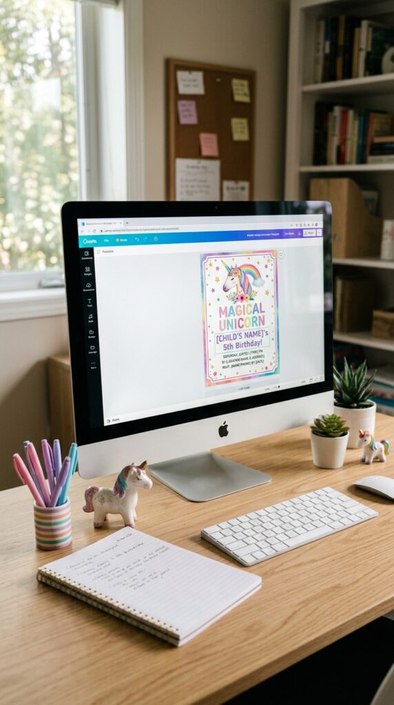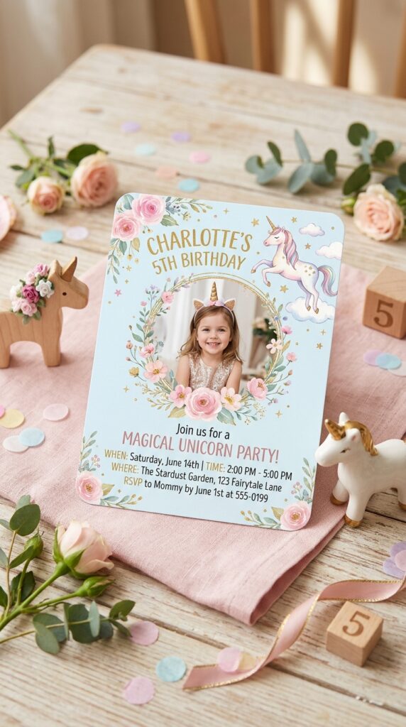 Platforms like Canva and Etsy offer downloadable templates you can personalize in minutes. Simply swap in your child’s name, date, and party details. Many templates even let you adjust colors to match your theme. It’s a genuinely stress-free option that still delivers impressive, professionally polished results every single time. These templates work especially well for 5th birthday celebrations, where unicorn themes are particularly popular and cherished among young children.