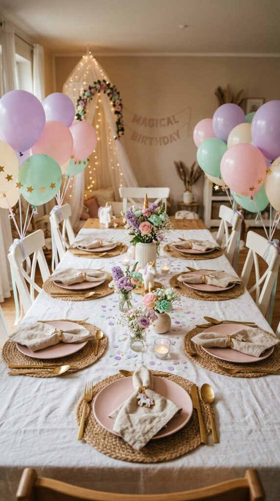 Setting a dreamy unicorn table doesn’t have to cost a fortune or take hours to pull together. Start with a white or pastel tablecloth, then use natural textures like woven placemats or linen napkins to ground the look.