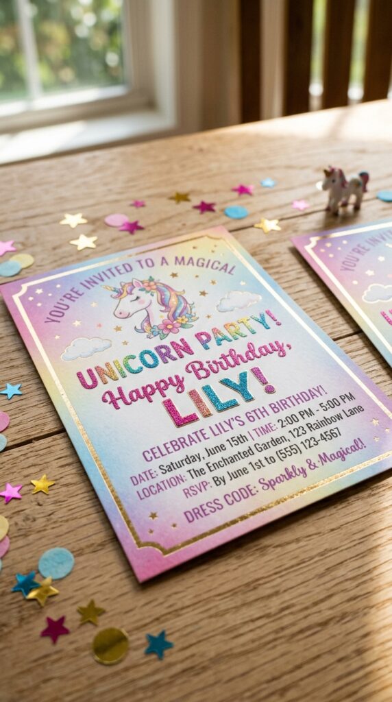 Want something extra special? Choose personalized unicorn invitations with the birthday child’s name styled in sparkly lettering. Etsy sellers and Canva templates both offer stunning options you can customize quickly.