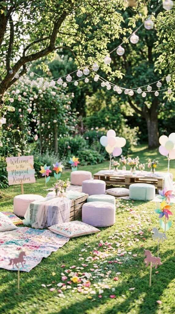 A garden setting gives you five natural advantages for a unicorn party: open space, soft lighting potential, floral backdrops, fresh air, and room for activities that simply can’t happen indoors. String iridescent fairy lights between trees and scatter unicorn themed lawn decor like rainbow pinwheels and glittery horn stakes throughout your flower beds.