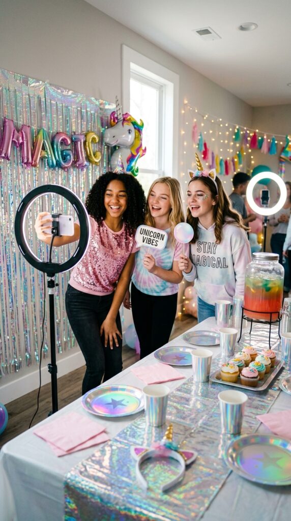 Think iridescent everything — cups, plates, and table runners in holographic silver and pastel hues. Set up a unicorn themed selfie station with a shimmer backdrop, ring lights, and fun props. Teens will actually use it.