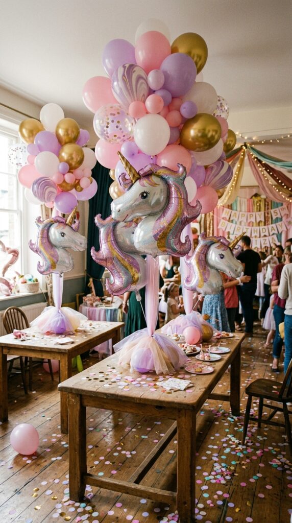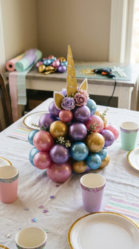 For DIY unicorn centerpieces, twist together metallic balloons, add a paper horn, and boom — you’ve got a showpiece.