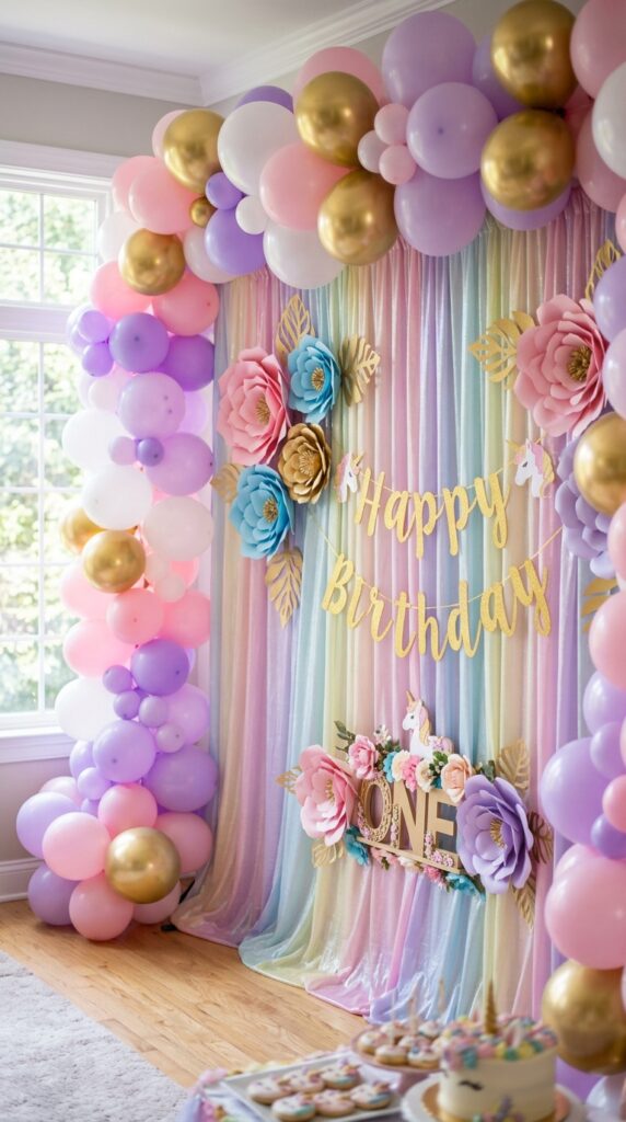 Want something bolder? Design an eye-catching unicorn mural using removable wall decals — they’re inexpensive, easy to apply, and completely mess-free. Add a “Happy Birthday” banner to finish it off. For even more inspiration, explore unicorn party backdrop ideas specifically designed to create stunning photo setups that make every shot look enchanting. Trust me, this becomes the most photographed spot all night.