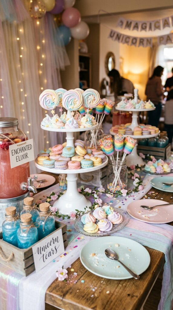 Don’t forget themed drink stations featuring pink lemonade, lavender spritzers, or “unicorn hot chocolate” topped with rainbow sprinkles. Label everything with fanciful signs like “Unicorn Tears” or “Enchanted Elixir.”