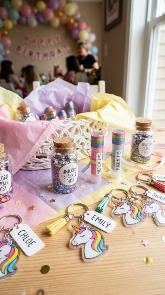 For unicorn inspired party favors, skip the cheap plastic. Go for mini skincare sets, glitter lip glosses, or customized tote bags. These feel special and age-appropriate without abandoning the magical theme entirely.