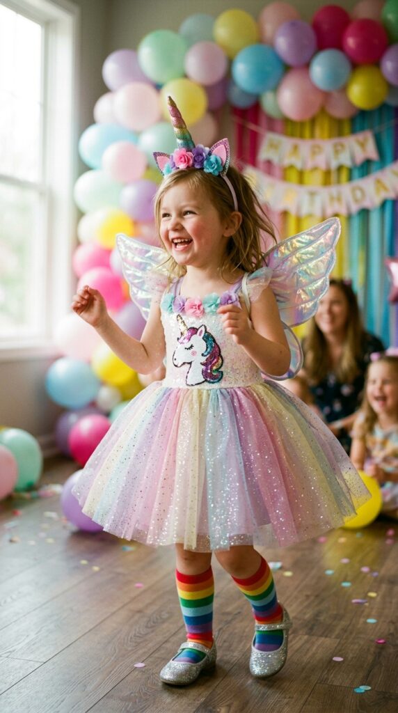 Keep it fun and age-appropriate, and let the birthday star’s personality shine through every magical detail they wear. Guests can also join in the fun with unicorn-themed birthday outfits that coordinate with the birthday girl’s look for adorable group photos.