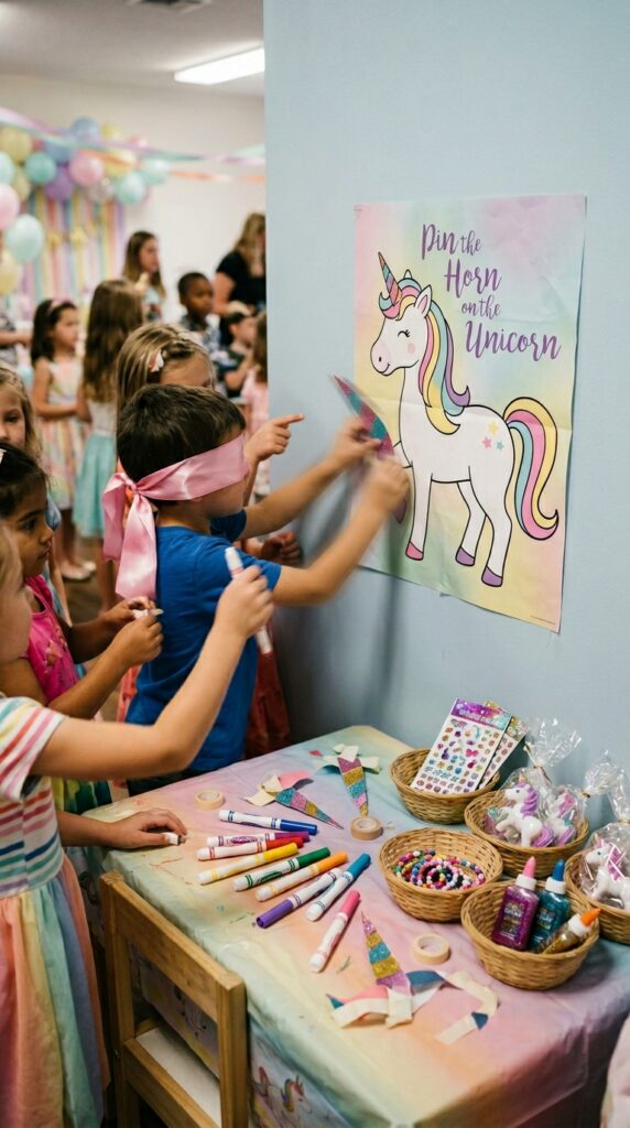 Split kids into teams and award sparkly prizes for correct answers. Both games work beautifully for mixed age groups because you can easily adjust the difficulty level to keep everyone engaged and having fun. Classic options like pin the horn on the unicorn are always a hit and easy to set up for guests of any age.