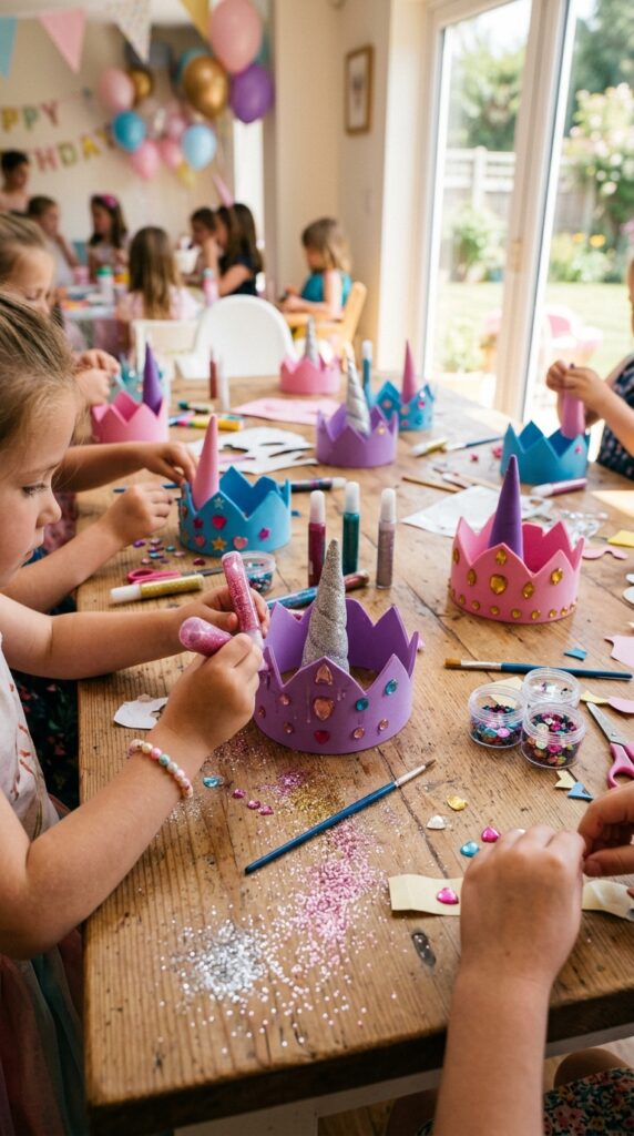 Set up a DIY unicorn crowns station with foam, glitter, and adhesive gems. Kids can customize their crowns however they want, and you’ll love watching their creativity unfold.