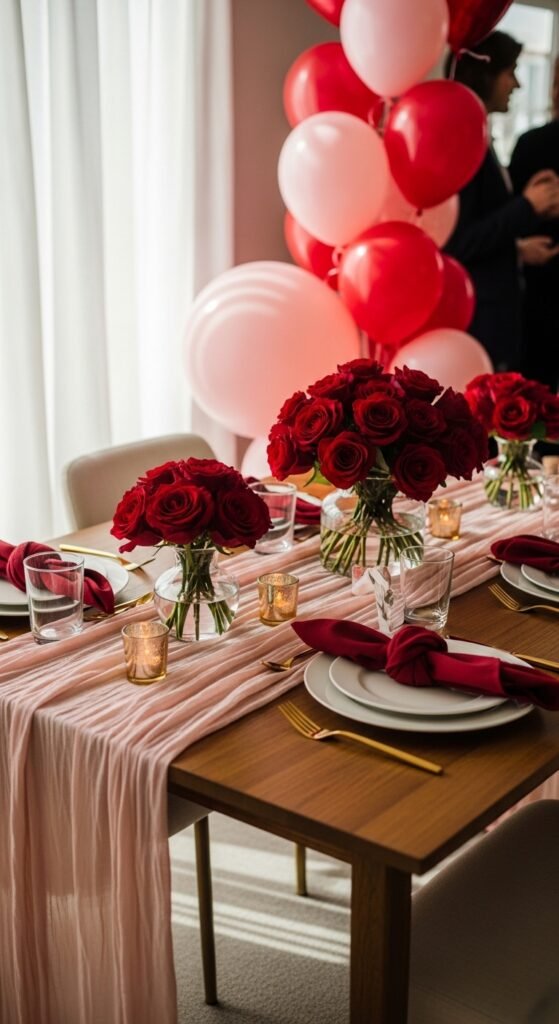 Start with blush pink as your base color for tablecloths and backdrop. Then layer in deep red through flowers, napkins, and accent pieces. This creates visual depth without overwhelming your guests. The combination feels graceful rather than overly sweet, perfect for celebrating both love and new life together.