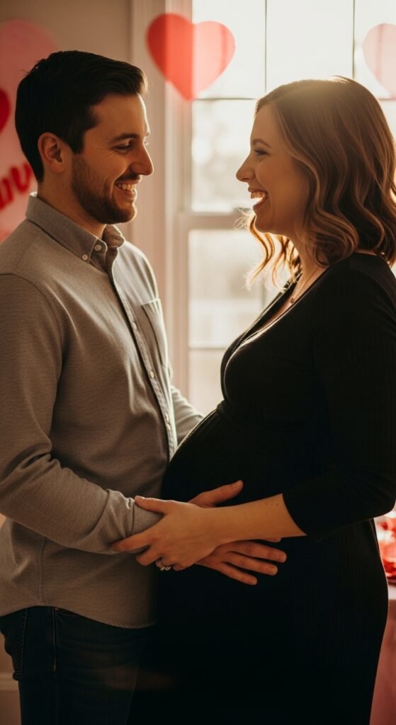 Set up a designated photo corner with soft pink lighting and rose petals scattered on the floor. These intimate couple shots will become treasured keepsakes—think gentle hand-on-belly poses with romantic backlighting.