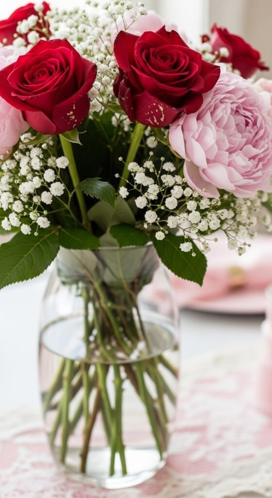 When romance meets motherhood, roses become the perfect floral centerpiece for your Valentine’s baby shower. You’ll want to create sophisticated floral arrangements that blend pink and red roses with baby’s breath for that dreamy romantic touch.