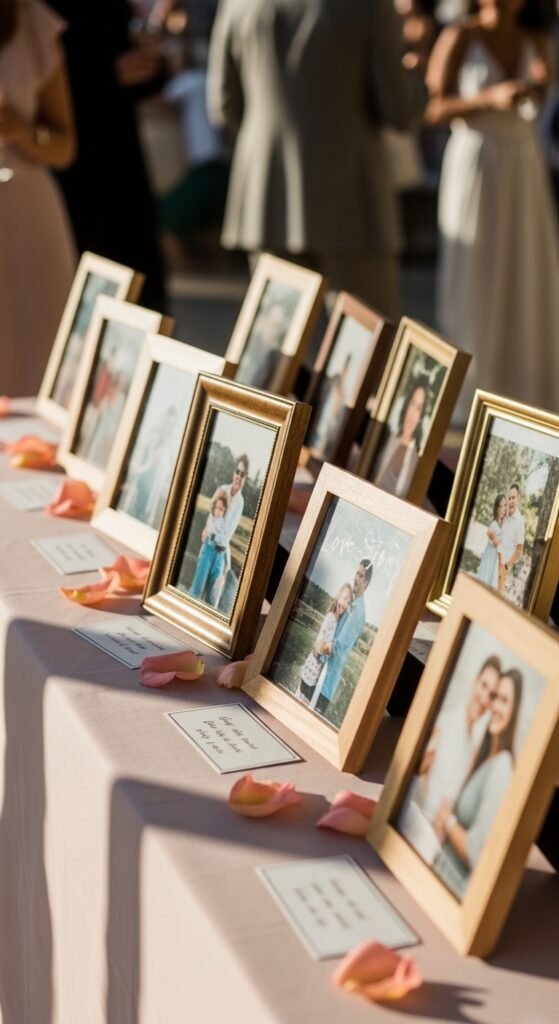 Craft a love storybook display using photo frames arranged chronologically along a table runner. Start with their first date photo, then engagement, wedding, and pregnancy announcement. I love adding handwritten captions beneath each frame—it feels more intimate.