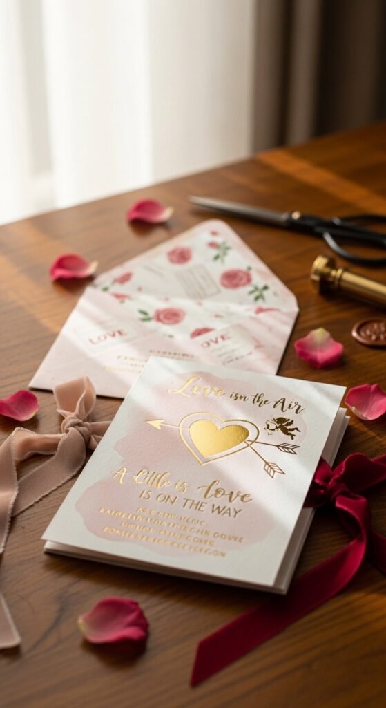 Add unique envelope liners featuring romantic patterns like roses or vintage love letters. This small detail makes opening invitations feel special. Include sweet phrases like “Love is in the Air” or “A Little Love is on the Way.” Digital printing services make creating professional-looking invitations affordable and easy.