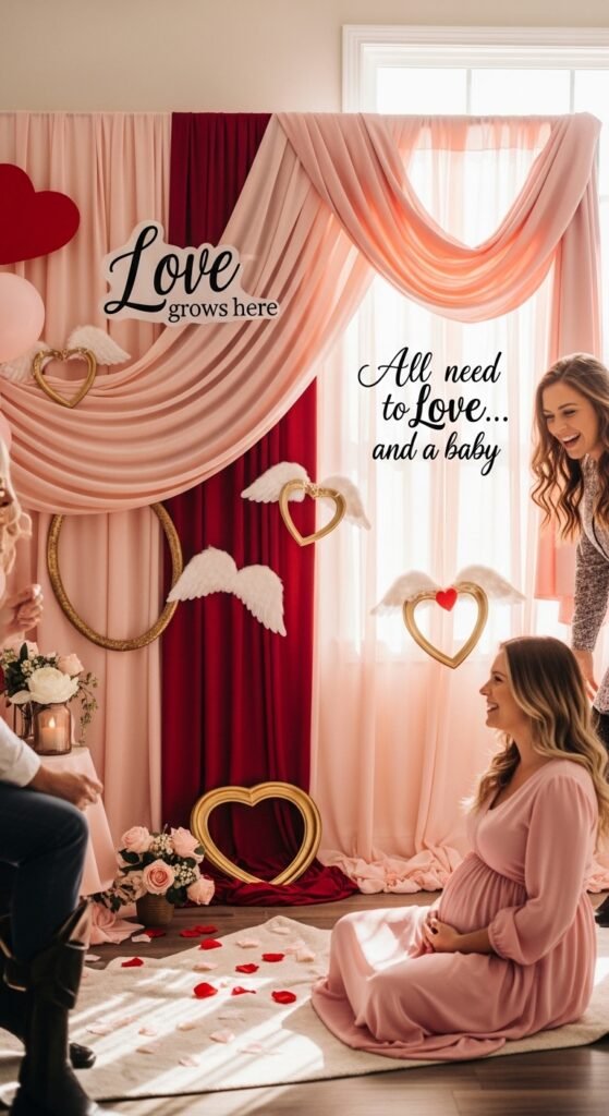 Complete your setup with romantic photo props: heart-shaped frames, cupid wings, and arrow signs. Your guests will absolutely love posing with these charming touches while celebrating the mom-to-be.